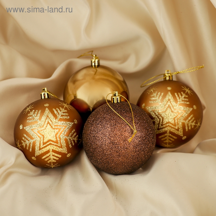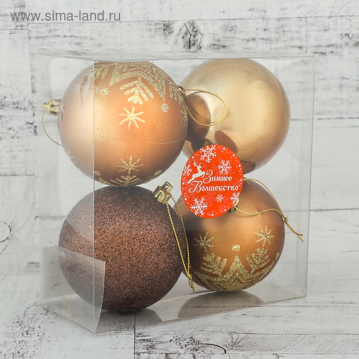 Набор шаров пластик d-8 см, 4 шт "Снежинка блеск" кофейный