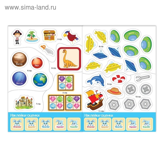 На каждой страничке есть задание, места для наклейки-ответа и наклейки-оценки. Поощряйте ребёнка при правильном выполнении задания и не ругайте, если малыш ошибётся.