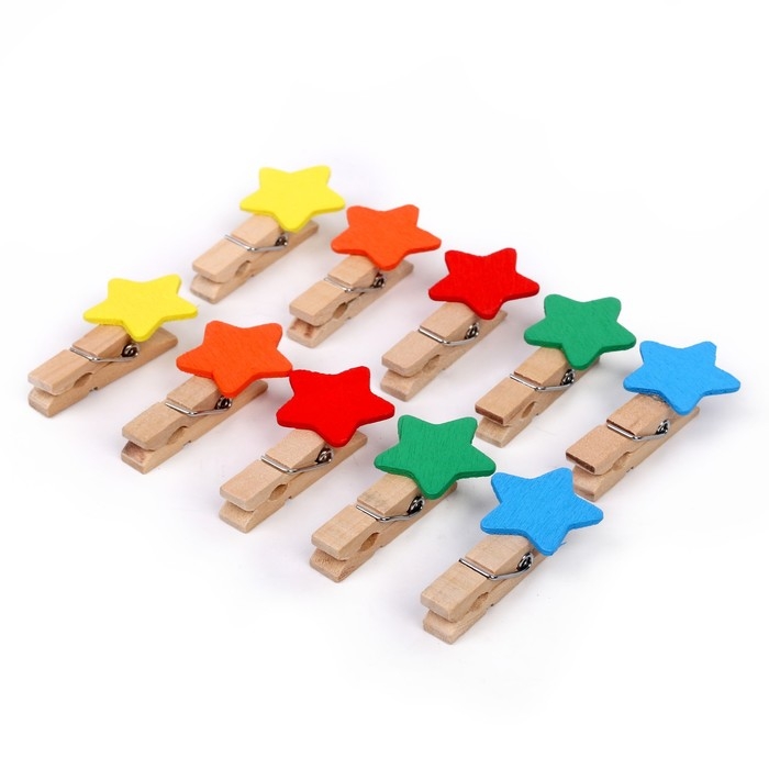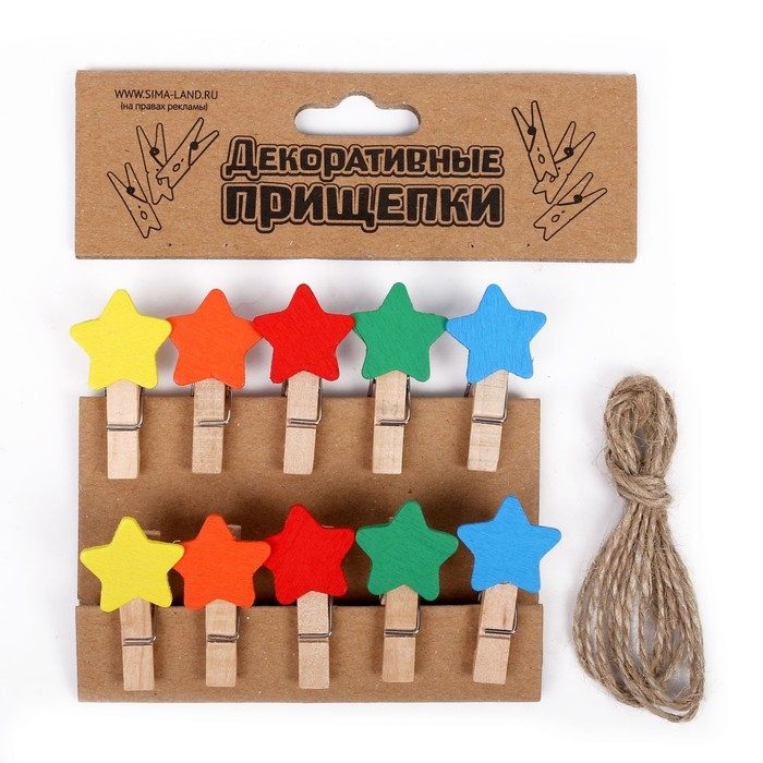 Набор для фото и декора "Цветные звёзды", в наборе прищепки 10 шт., верёвка — 100 см, прищепка: 4 × 0,7 × 1 см — это не только полезные приспособления в хозяйстве, но также элементы оформления интерьера, цветочных композиций, декорирования подарков, открыток и многого другого.