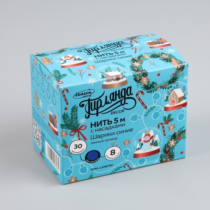 Гирлянда «Нить» 5 м с насадками «Шарики синие», IP20, тёмная нить, 30 LED, свечение синее, 8 режимов, 220 В
