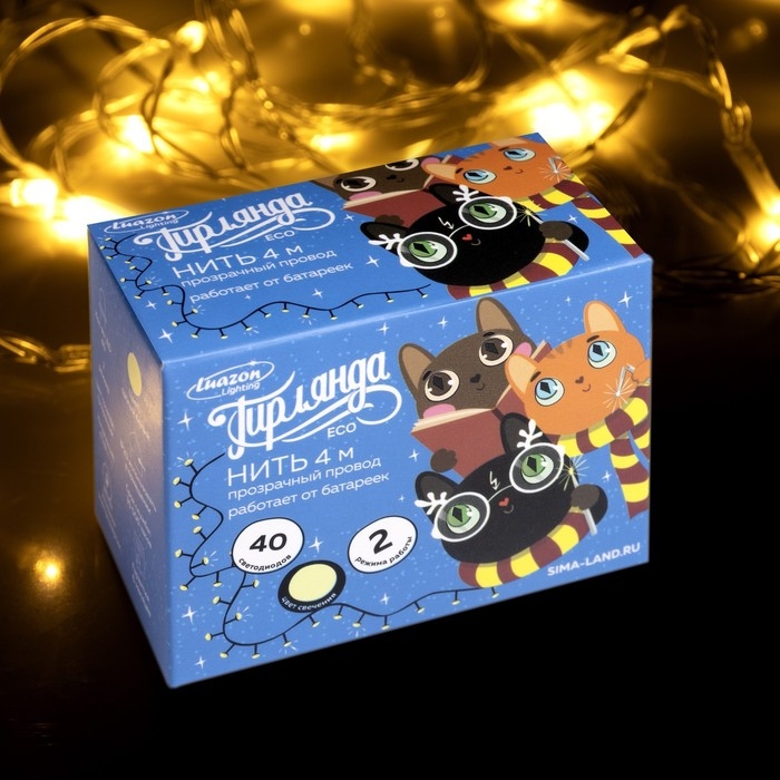 Гирлянда «Нить» 4 м, IP20, прозрачная нить, 40 LED, свечение тёплое белое, 2 режима, AAх3