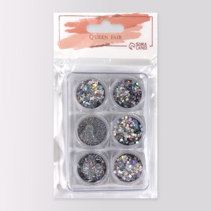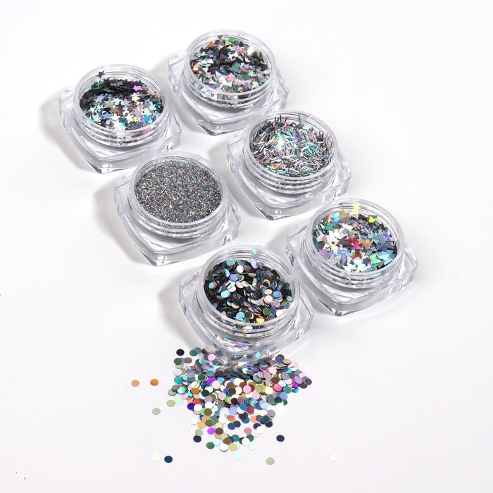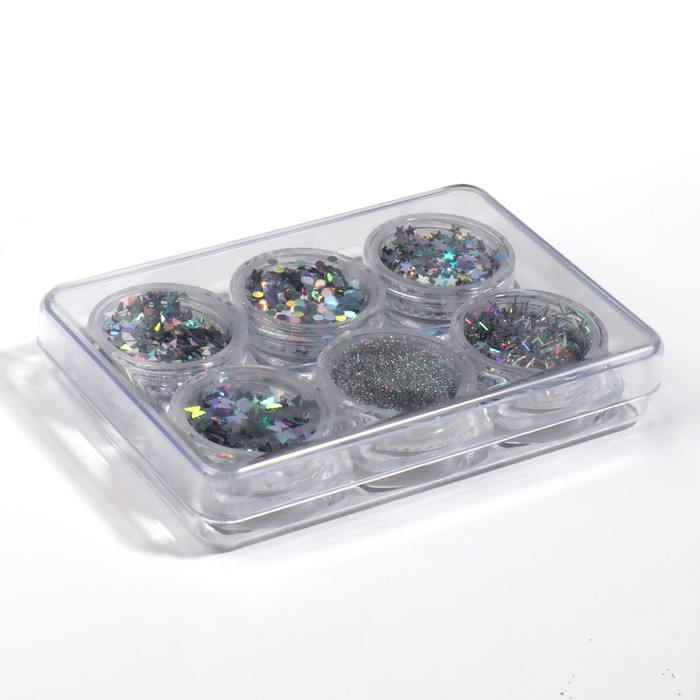 Набор для декора ногтей, в пластиковом органайзере, 6 баночек, цвет серебристый