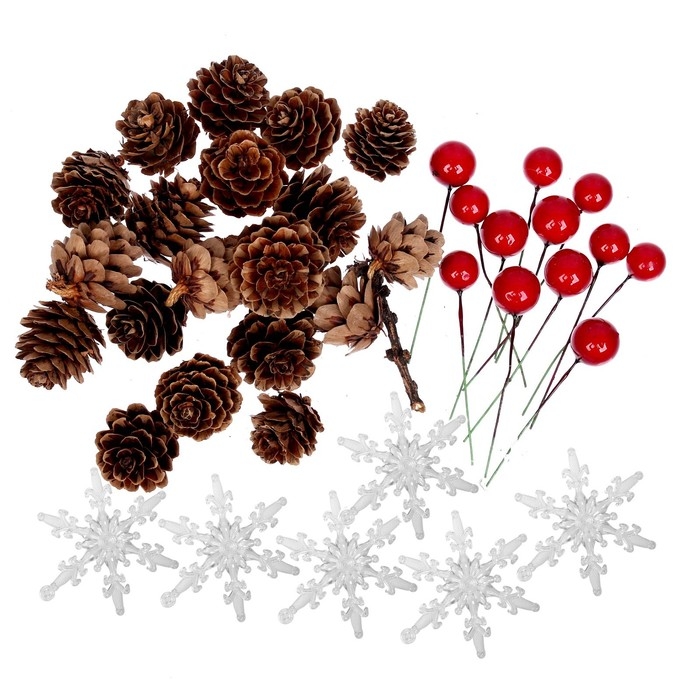 Набор декора «Ледяная сказка» — это стильное решение для создания праздничной атмосферы в интерьере. Комплект включает элементы из пластика и природные материалы, такие как шишки, что придаёт украшению естественный и зимний вид. Идеально подходит для новогоднего декора в скандинавском стиле.