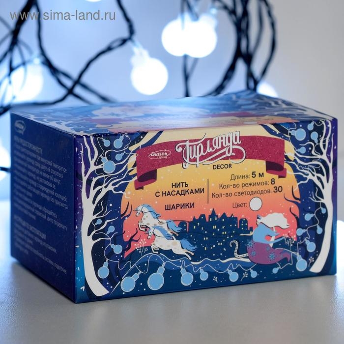 Гирлянда «Нить» 5 м с насадками «Шарики белые», IP20, тёмная нить, 30 LED, свечение белое, 8 режимов, 220 В