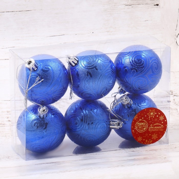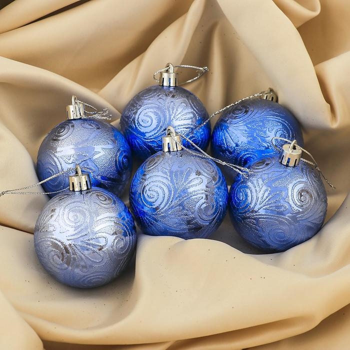 Набор шаров пластик d-6 см, 6 шт "Кружевной узор" синий