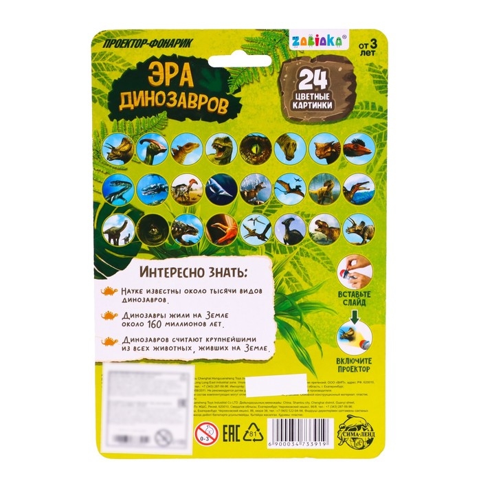 Проектор-фонарик «Эра динозавров», свет, 3 слайда, 24 картинки, цвета МИКС