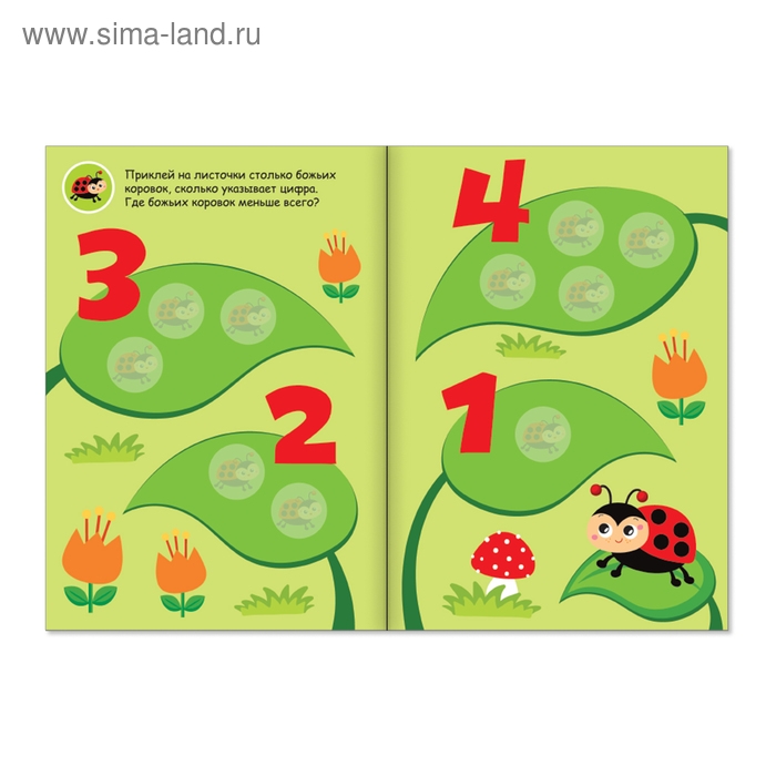 Внутри книги малыша ждут интересные задания, в которых нужно подобрать наклейки по форме, цвету и смыслу и приклеить в определённое место.