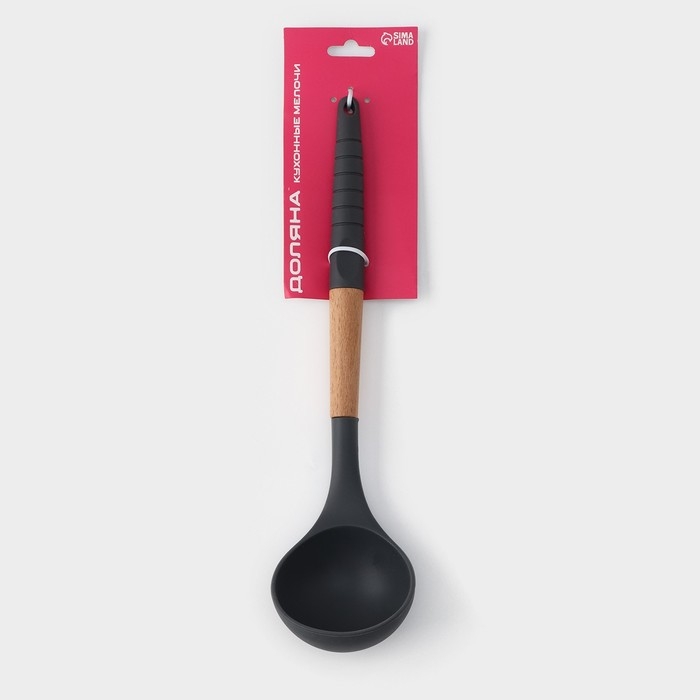 - Выполнен из экологичных материалов. Рукоятка разливной ложки выполнена из натурального дерева. Рабочая часть предмета - из термостойкого пищевого силикона.
