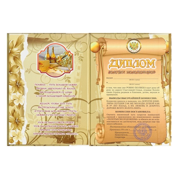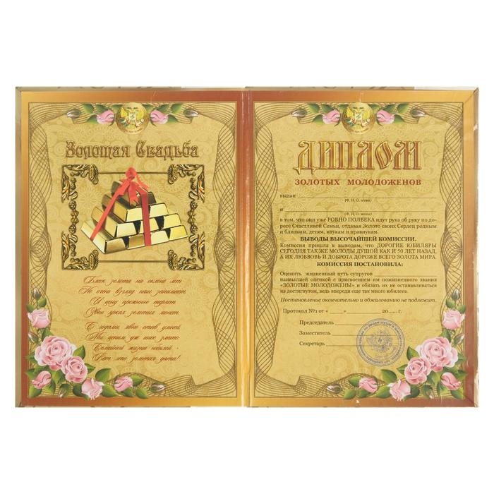 Диплом "Золотая свадьба - 50 лет" 150 х 210 мм