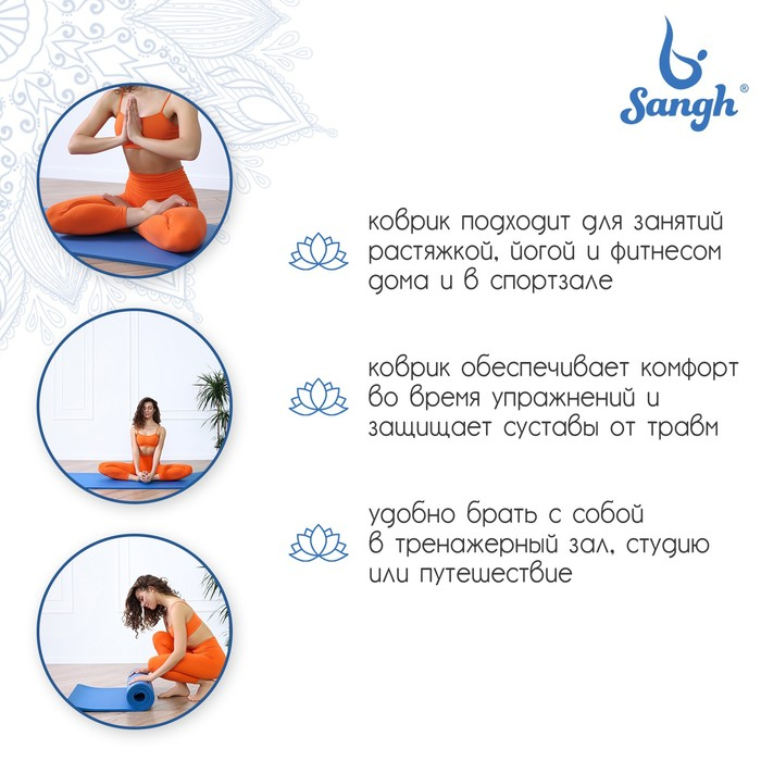 Коврик для йоги Sangh, 183×61×1,5 см, цвет синий
