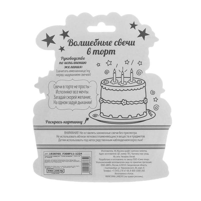 Свечи для торта - это неотъемлемый атрибут праздника. Набор свечей станет прекрасным украшением торта и других кондитерских изделий по случаю дня рождения, юбилея и любого другого торжества. Украсьте угощение стильными свечами, чтобы сделать особенный день ещё более ярким и незабываемым. Для того, чтобы свечи не задувались, им нужно дать 60 секунд разгореться, после чего их можно будет задувать, но уже через несколько секунд, как они погаснут, свечи загорятся снова. Для того,чтобы свечи все-таки потушить, их рекомендуется примочить водой или придавить фитиль свечи. Изготовлены из высокоочищенного пищевого парафина, который не влияет на вкусовые качества блюд, а удобная упаковка помогает сохранять свечи при длительном хранении и транспортировке.