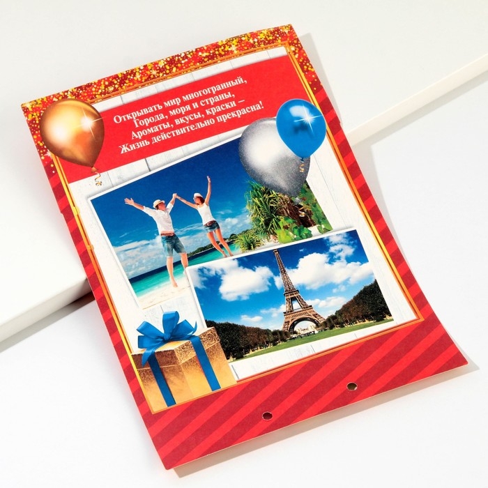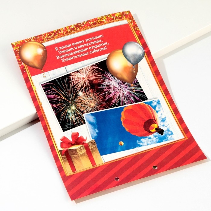 Дизайнерская открытка состоит из 5 листов, скреплённых лентой. На каждой странице с тёплыми пожеланиями располагается индивидуальный конверт. Положите внутрь банкноты — и мечты именинника станут явью.