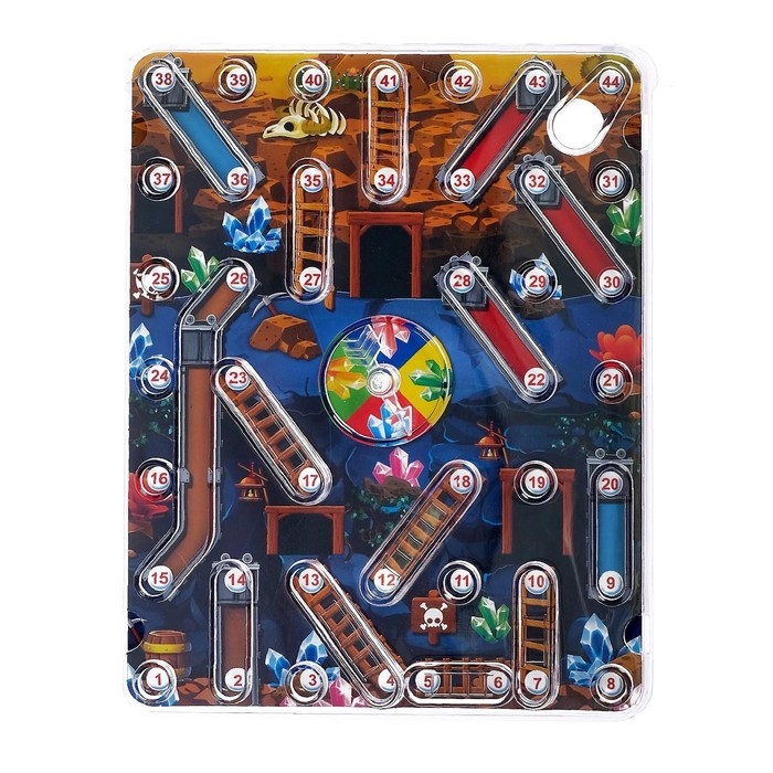 В тайном подземелье спрятан клад семи гномов. Каждый из игроков мечтает о нём, но лабиринты очень запутаны. Ставьте свой шарик на старт и крутите рулетку – она покажет, на сколько ходов вам нужно идти вперёд. Но будьте осторожны – путь опасен. Вы можете легко скатиться по горкам обратно вниз или забраться по лесенкам наверх. Кто доберётся до клада первым?