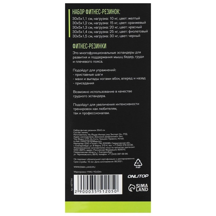 Набор фитнес-резинок ONLYTOP: нагрузка 10, 15, 20, 25, 30 кг, 5 шт., 30х5 см