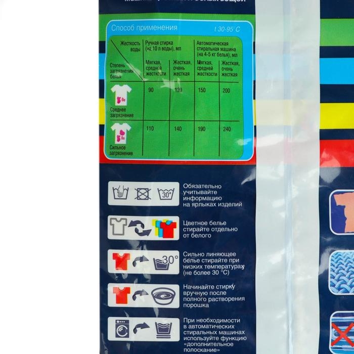 Способ применения: ручная стирка – среднее загрязнение 90 г на 10 л воды, сильное загрязнение 110 г на 10 л воды. Машинная стирка – среднее загрязнение 150 г на 4-5 кг сухого белья, сильное загрязнение на 190 г на 4-5 кг сухого белья.