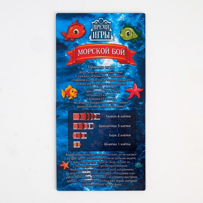 Расставьте на поле боя корабли разного размера, стреляйте по полю врага, стараясь угадать координаты корабля противника.