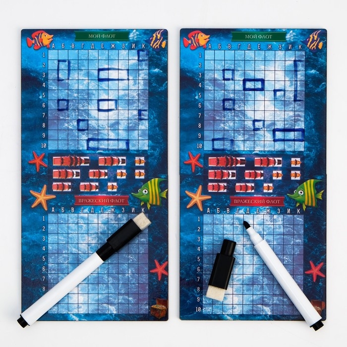 Настольная игра морской бой "На Дальних берегах", 2 стираемых маркера, 2 игровых поля