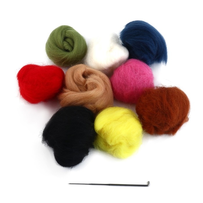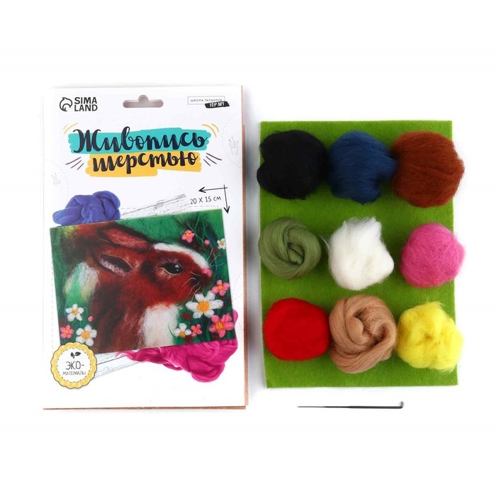 В комплекте вы найдёте лоскуты цветной шерсти, специальную иглу и лист фетра, который будет служить холстом для вашей картины. Дополнительно вам понадобятся ножницы, губка или кусок поролона и немного воды для смачивания пальцев во время работы.