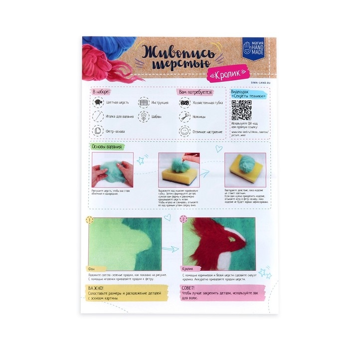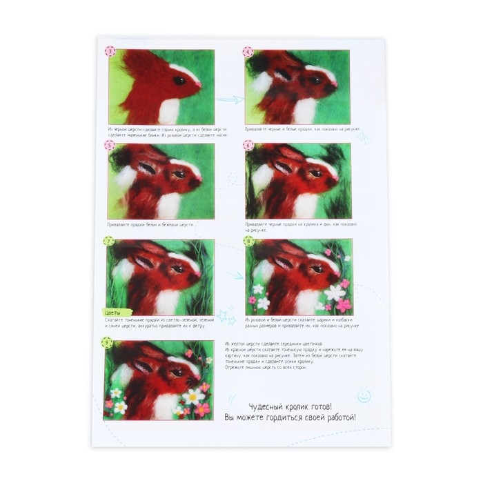 Данный вид творчества основан на валянии. Никогда не слышали о такой технике? Это не проблема: создать мягкое и пушистое панно вам помогут подробные инструкция, входящая в набор.