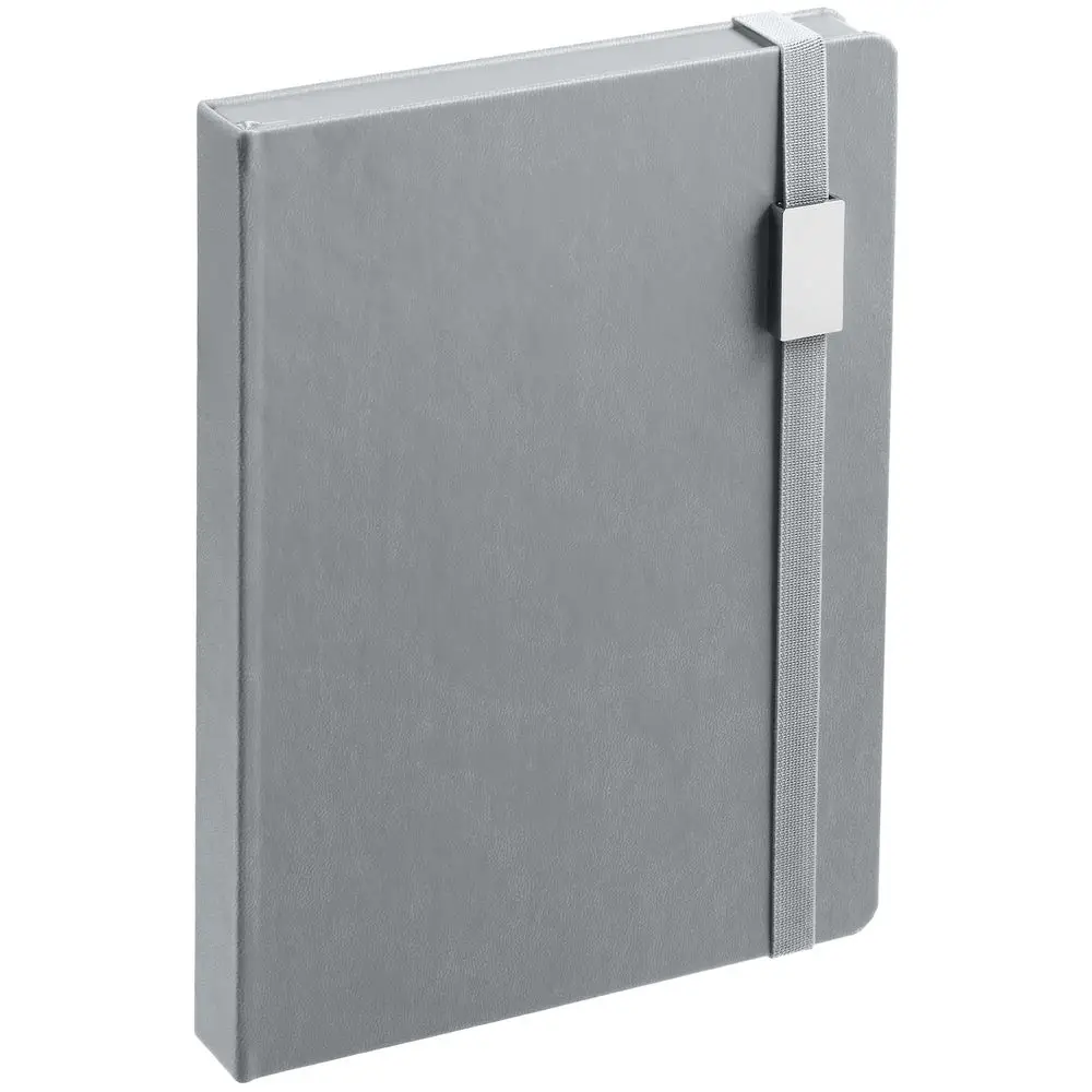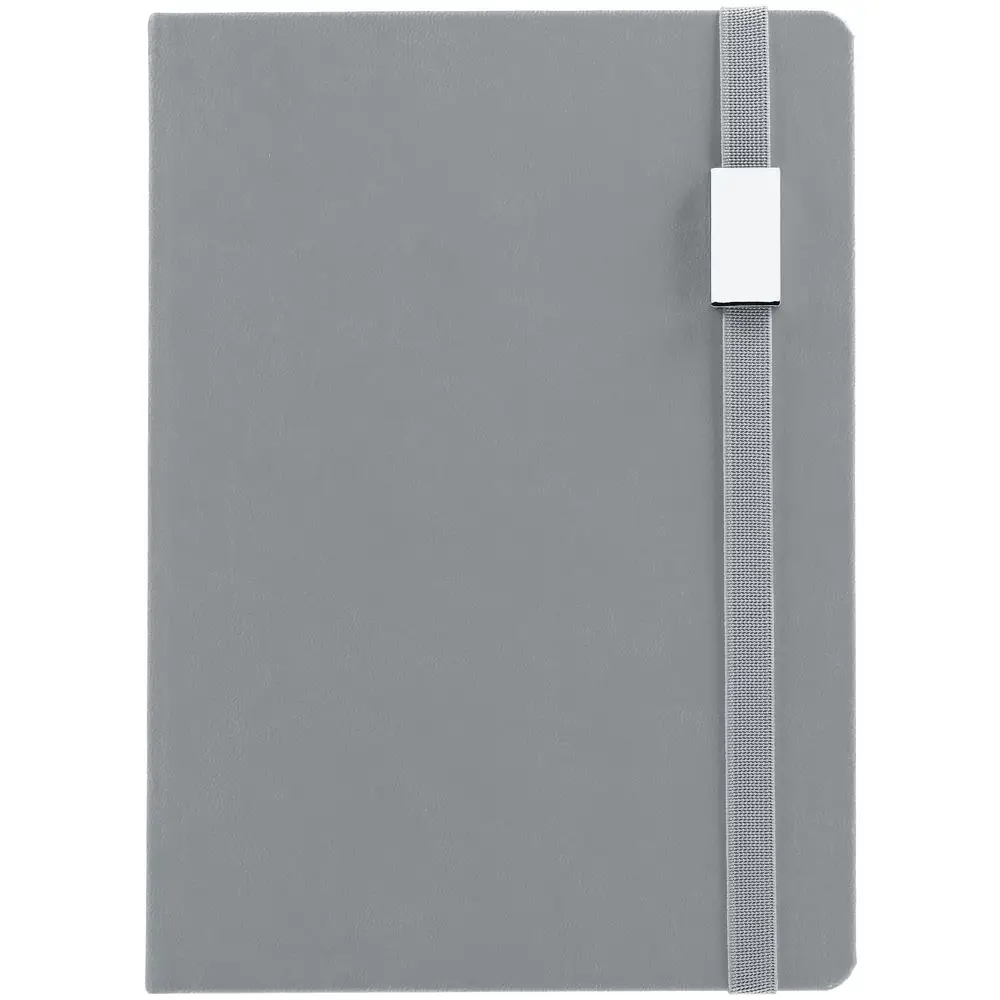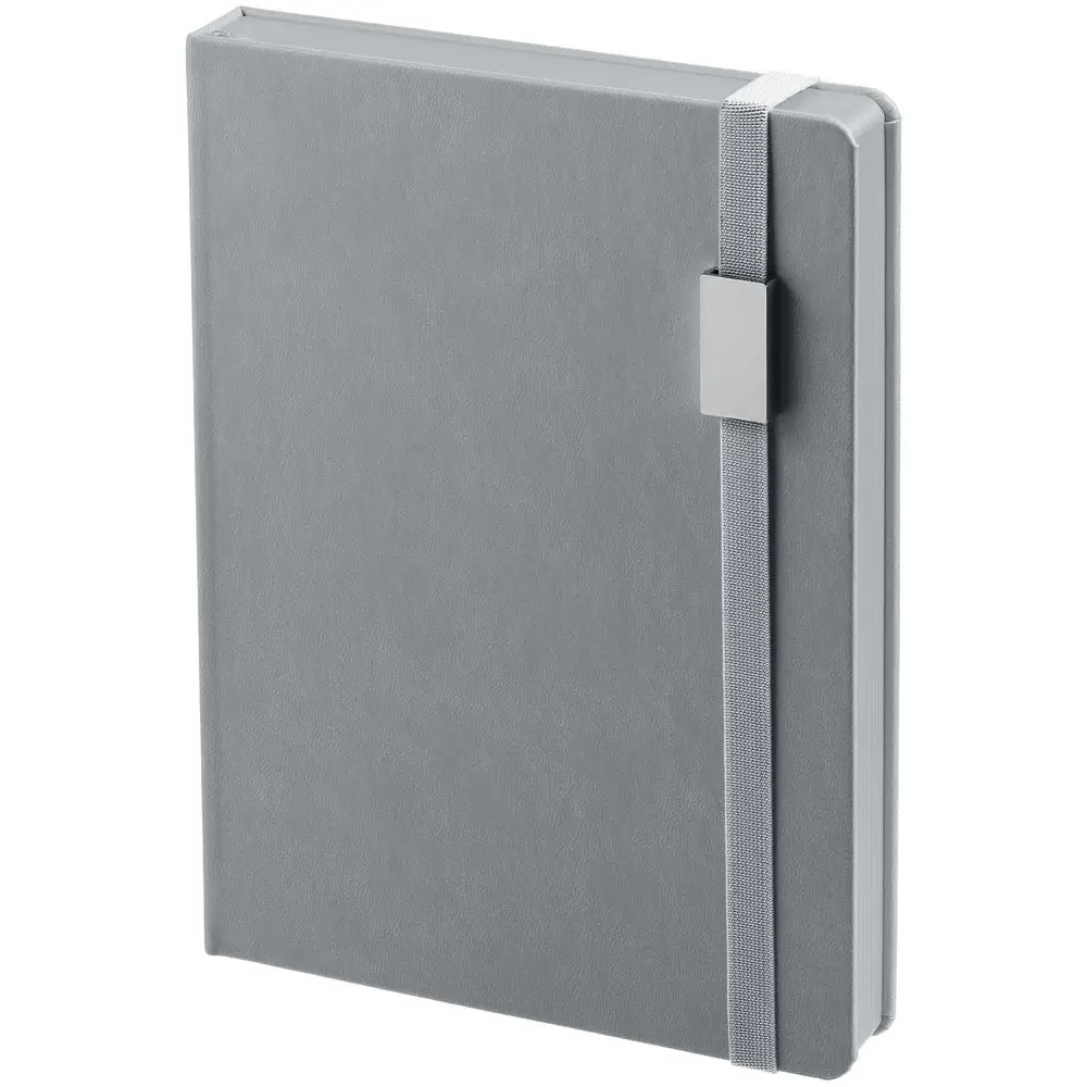 Ежедневник с твердой обложкой, выполнен из материала Latte, серый СС, обрез серого цвета, дополнен ляссе серого цвета и резинкой с металлическим шильдом.