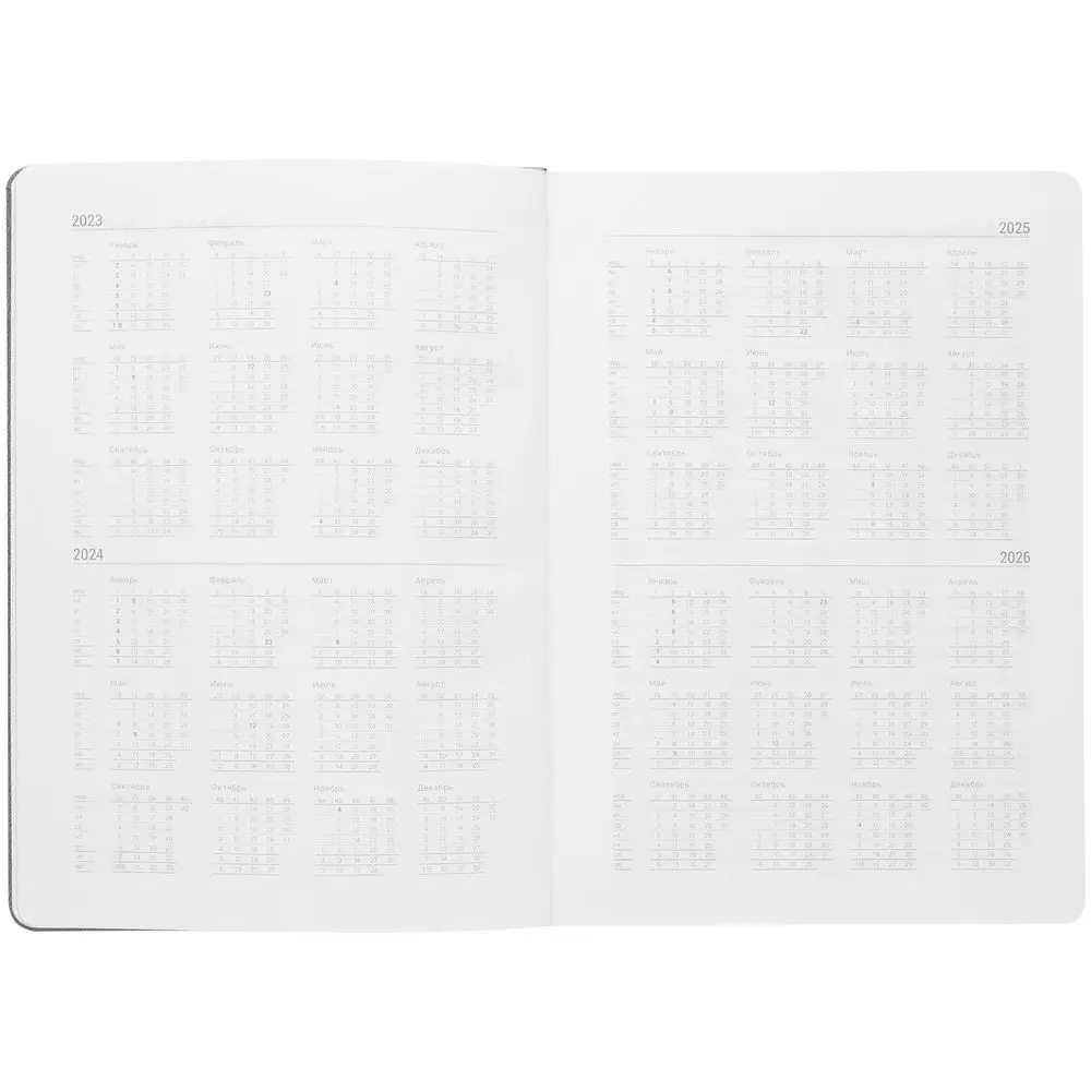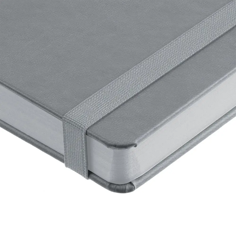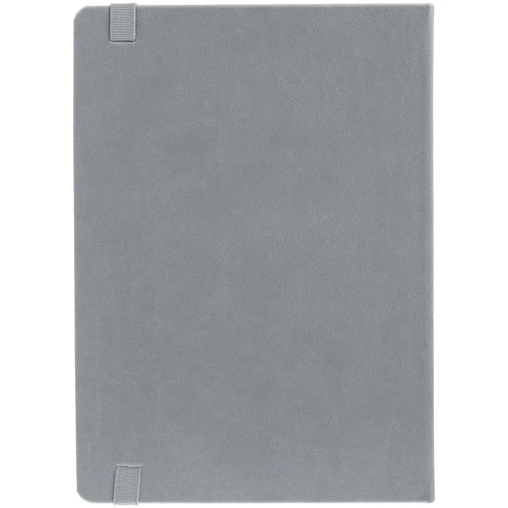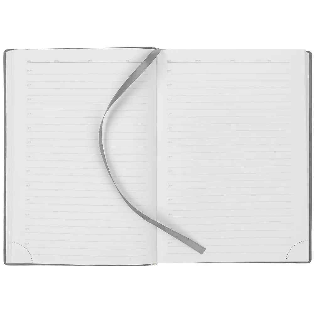 Ежедневник с твердой обложкой, выполнен из материала Latte, серый СС, обрез серого цвета, дополнен ляссе серого цвета и резинкой с металлическим шильдом.