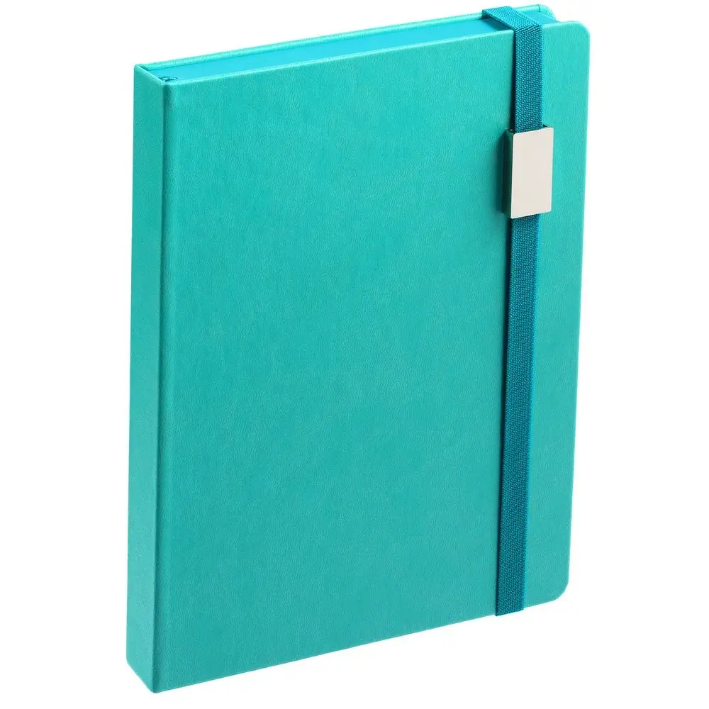 Ежедневник с твердой обложкой, выполнен из материала Latte, цвет морской волны II, обрез бирюзового цвета, дополнен ляссе бирюзового цвета и резинкой с металлическим шильдом.