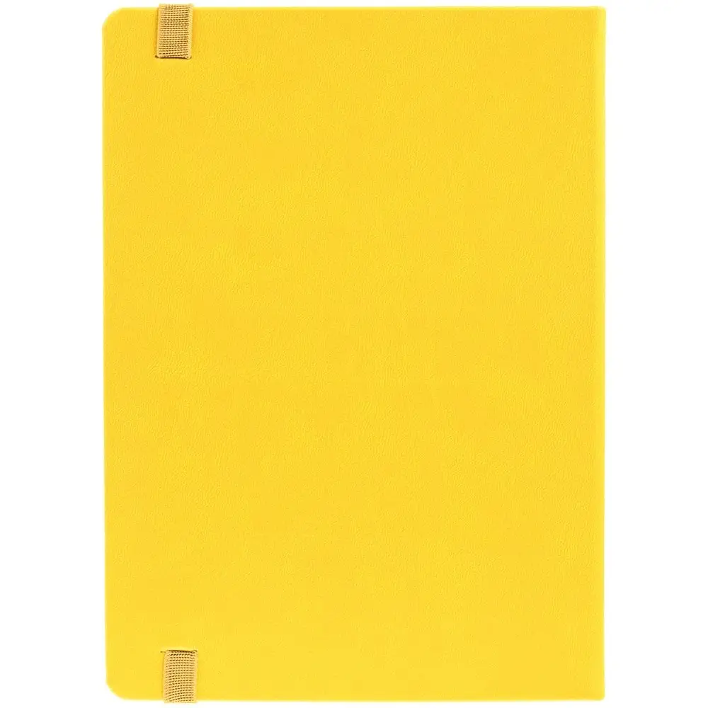 Ежедневник с твердой обложкой, выполнен из материала Latte, желтый КК, обрез зеленого цвета, дополнен ляссе желтого цвета и резинкой с металлическим шильдом.