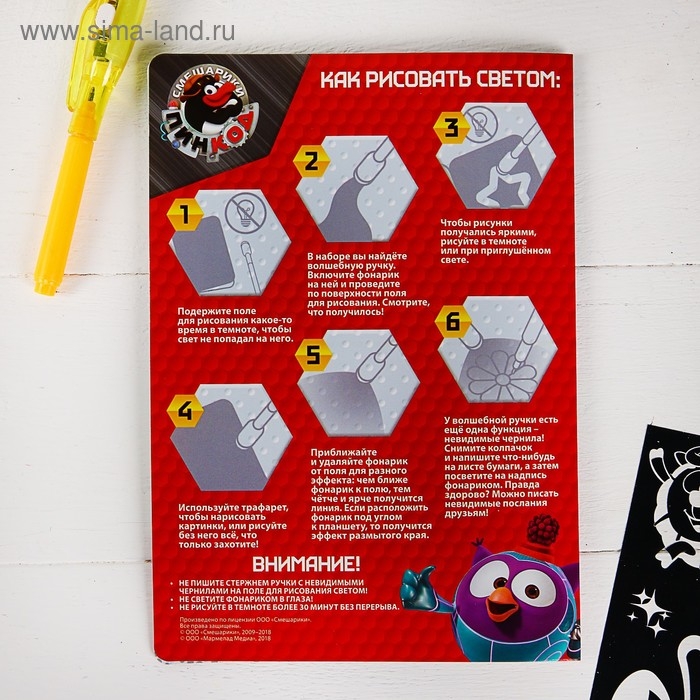 С помощью набора «Рисуем светом» и специального маркера ребёнок научится рисовать светом. Малыш будет создавать картинки, используя трафареты, или придумает собственные сюжеты.