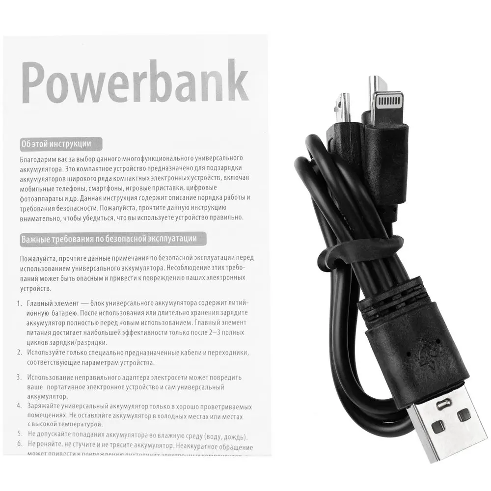 - В комплекте кабель с разъемами Type-C, Micro USB, Lightning (iPhone 5–14). Разъём Type-C без функции обмена данными может не распознаваться рядом операционных систем смартфонов. Необходимо использовать рекомендованный производителем кабель.