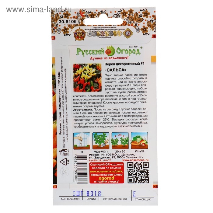 Семена Перец острый декоративный "Сальса" F1, серия Русский огород, 5 шт