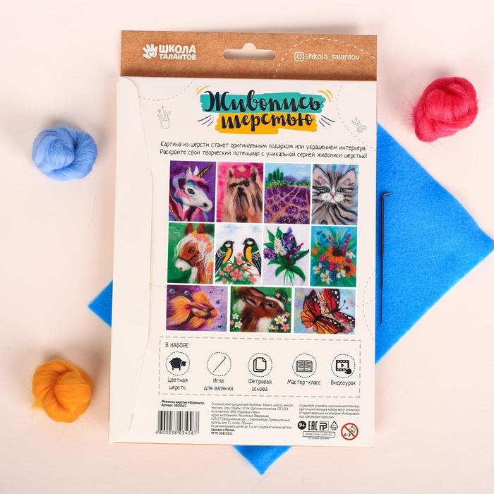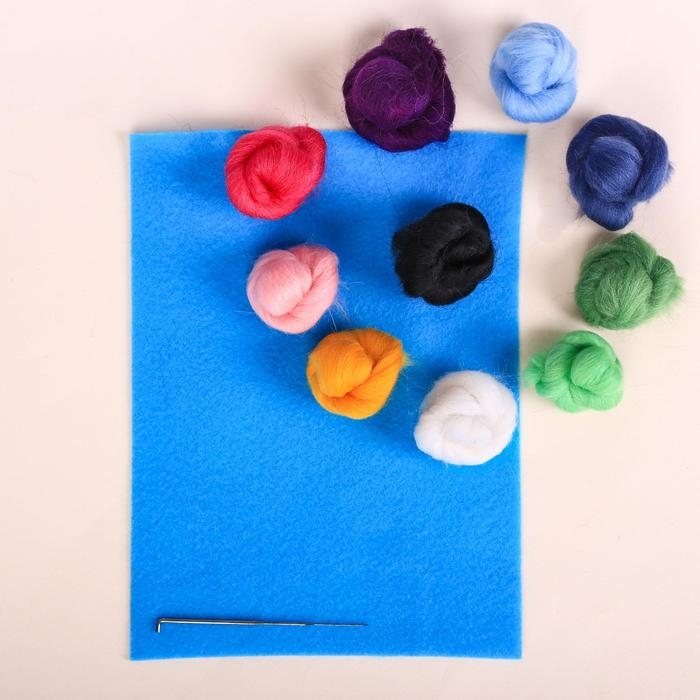 В комплекте вы найдёте лоскуты цветной шерсти, специальную иглу и лист фетра, который будет служить холстом для вашей картины. Дополнительно вам понадобятся ножницы, губка или кусок поролона и немного воды для смачивания пальцев во время работы.