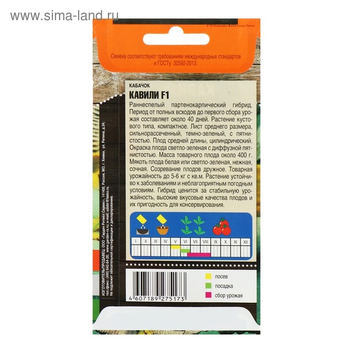 Раннеспелый партенокарпический гибрид. От всходов до первого сбора плодов проходит около 40 дней. Растение кустового типа, компактное, с очень короткими междоузлиями. Лист темно-зеленый с пятнистостью. Плоды цилиндрические, выровненные, светло-зеленой окраски с выраженным крапом, длиной 16-20 см, массой 0,4-0,7 кг. Мякоть белая, сочная, нежного вкуса. Плоды устойчивы к перезреванию. Гибрид ценится за стабильную урожайность, великолепный вкусовые качества плодов, пригодность их использования в консервации. Гибрид толерантен к мучнистой росе (Px), стрессовым условиям, повышенным температурам. Период плодоношения длится более 60 дней. Товарность плодов высокая. Рекомендуется для выращивания как в открытом, так и в защищенном грунте. Семена данного гибрида кабачка обработаны химическим протравителем. Посев должен производиться исключительно сухими семенами без предварительного замачивания в воде или стимуляторах роста. Плотность посадки — 2 растения/м². Урожайность — 12,0-15,0 кг/м².