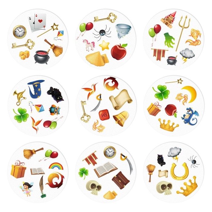 Первый, кто отыщет такую картинку, кричит её название, забирает верхнюю карту из колоды и кладет её сверху на свою карту. Тем самым он открывает следующую карточку из основной колоды. Теперь совпадения нужно искать уже с другими картинками.