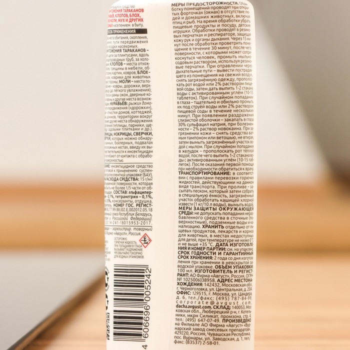 Способ применения: Спреем обрабатывают места обитания, скопления, обнаружения, пути передвижения насекомых (места отхождения обоев, трещины в мебели, обратные стороны картин, ковров).