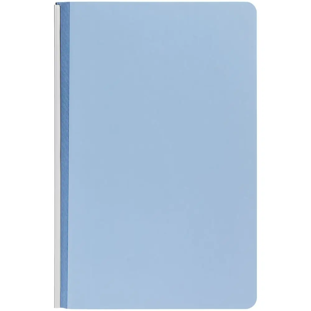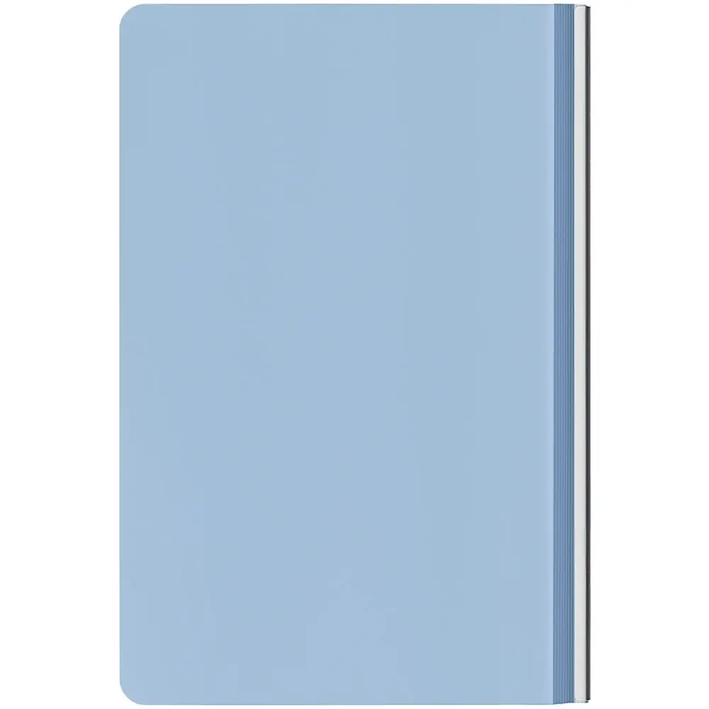 Ежедневник с гибкой обложкой и металлическим корешком, выполнен из материала Soft Touch, голубой JJ, дополнен серебристым обрезом блока и ляссе.