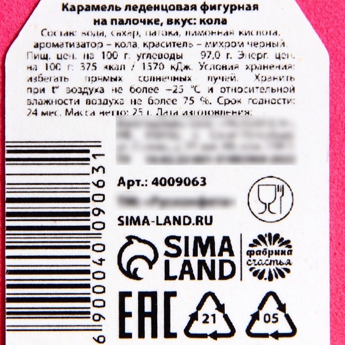 Состав: вода, сахар, патока, лимонная кислота, ароматизатор – кола, краситель - михром чёрный.