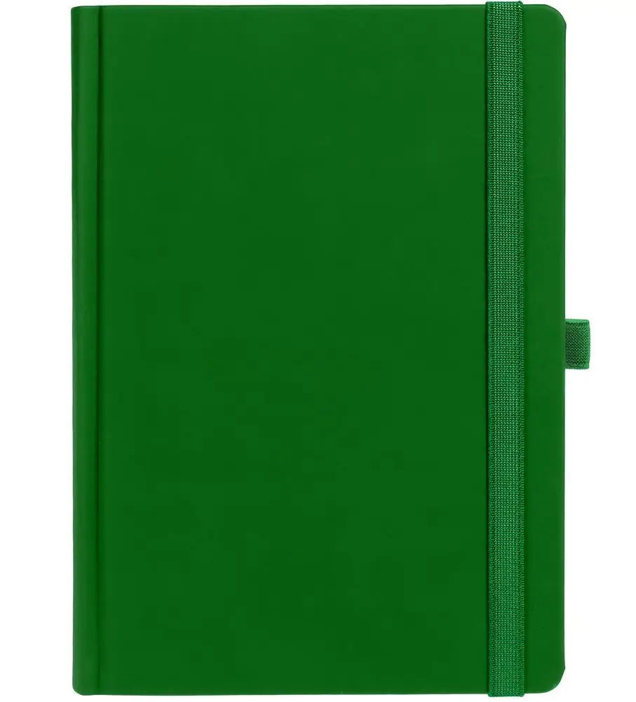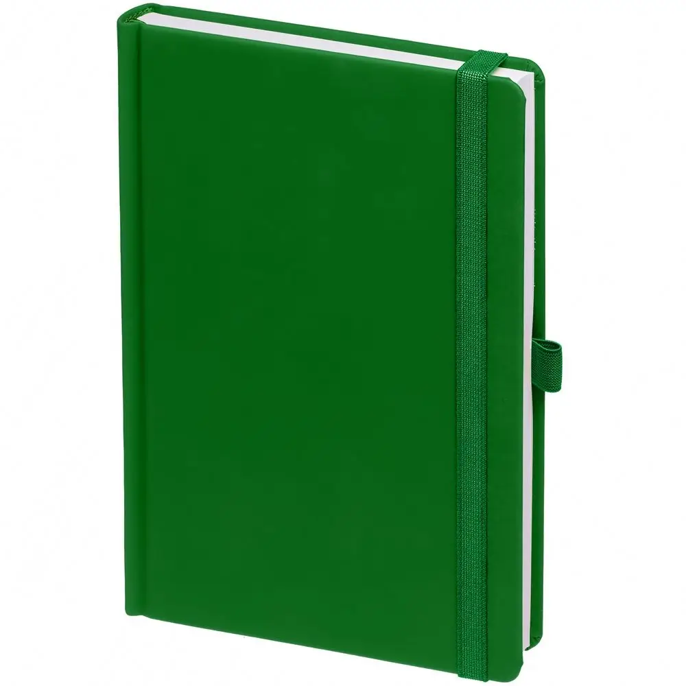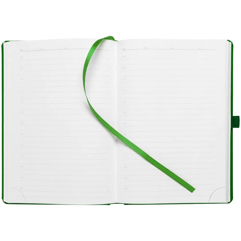 Ежедневник с твердой обложкой без поролона, выполнен из материала Soft Touch Ultra, зеленый FF, дополнен резинкой шириной 1 см, петлей-резинкой для ручки, капталом и ляссе ярко-зеленого цвета.