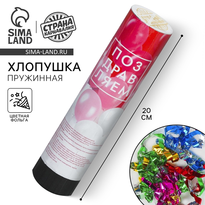 Пружинная хлопушка сделает любое событие ярким и станет эффектным заверешением вашего праздника! Поверните специально обозначенную часть, и она выстрелит серпантином, конфетти и фольгой. Такой фейерверк можно безопасно утроить дома и на улице — это вовсе не пиротехника. Будьте уверены: ваши поздравления будут услышаны! Компактную хлопушку можно взять с собой куда угодно.