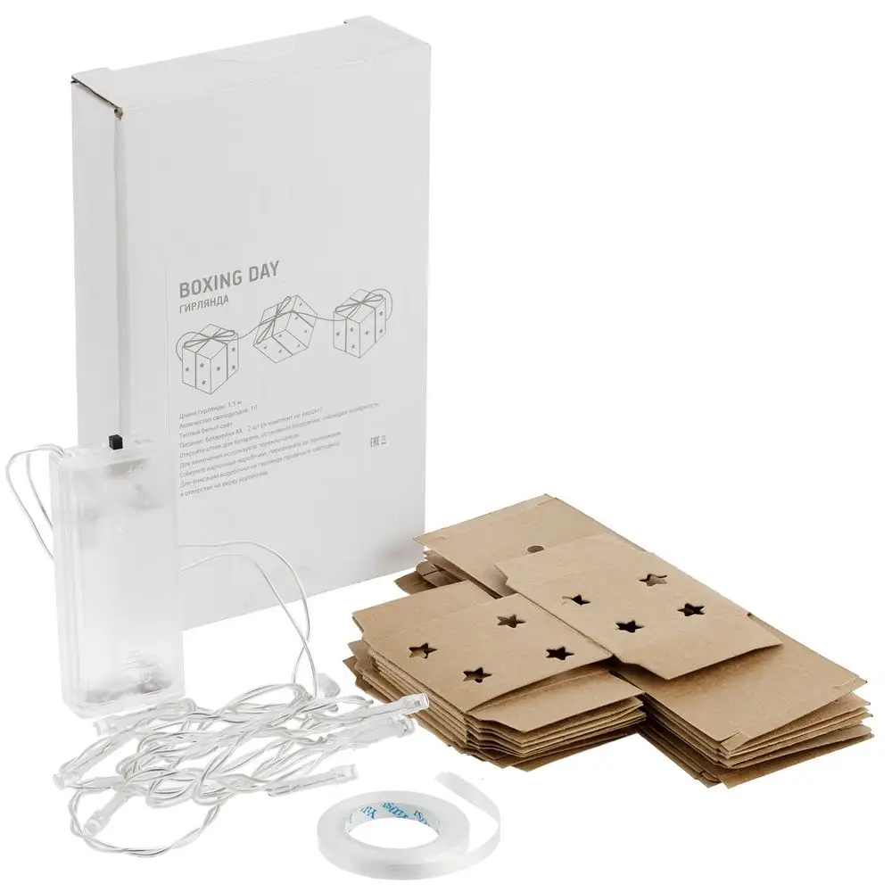 Оригинальная светодиодная гирлянда Boxing Day — это заряд позитива и сказочных огоньков в аккуратных мини-коробочках! Тот случай, когда свет можно не только подарить, но и упаковать, причем своими руками. Особенная прелесть гирлянды состоит в том, что получатель подарка сможет полностью сделать ее сам: получится приятное развлечение для всей семьи при подготовке к любимому празднику.