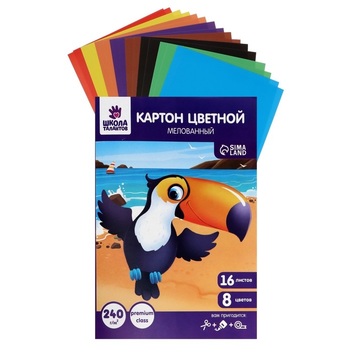 Картон цветной А4, 16 листов, 8 цветов, 240 г/м2, мелованный, в папке