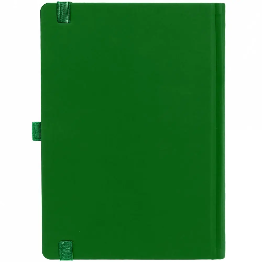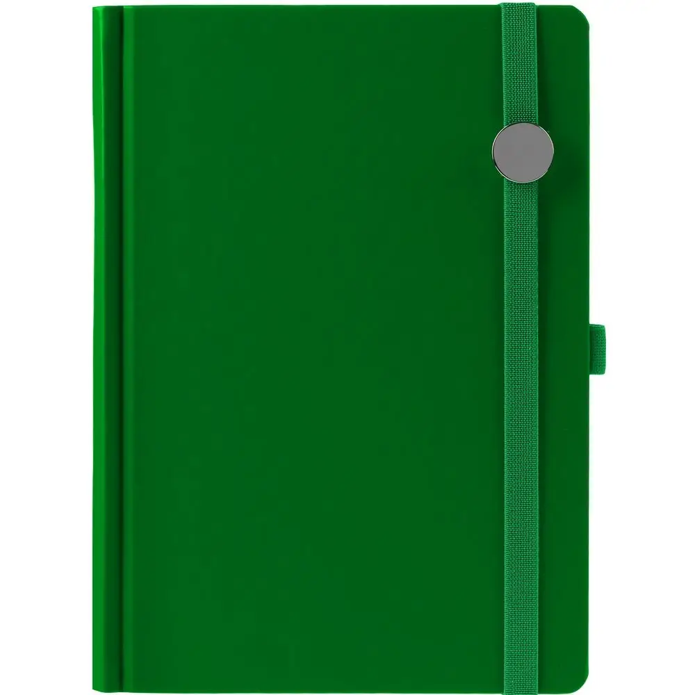 Ежедневник с твердой обложкой без поролона, выполнен из материала Soft Touch Ultra, зеленый FF, дополнен резинкой шириной 1 см, петлей-резинкой для ручки, капталом и ляссе ярко-зеленого цвета.
