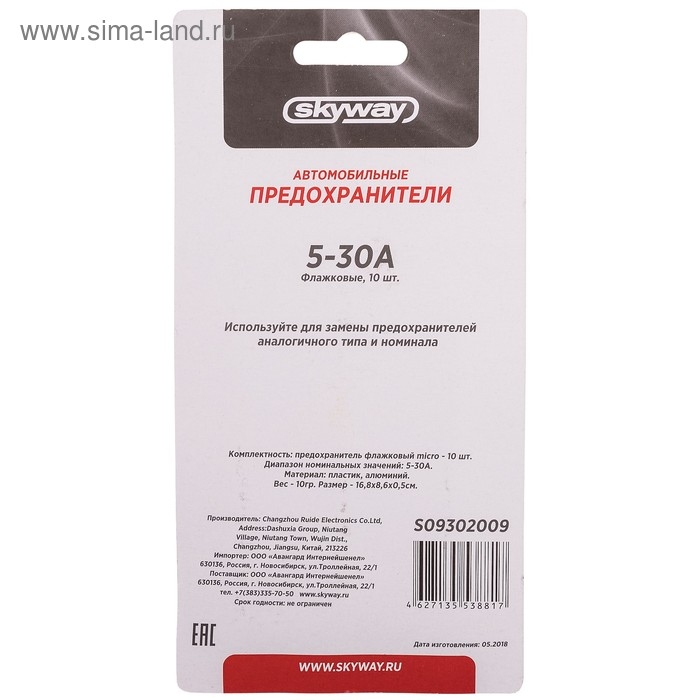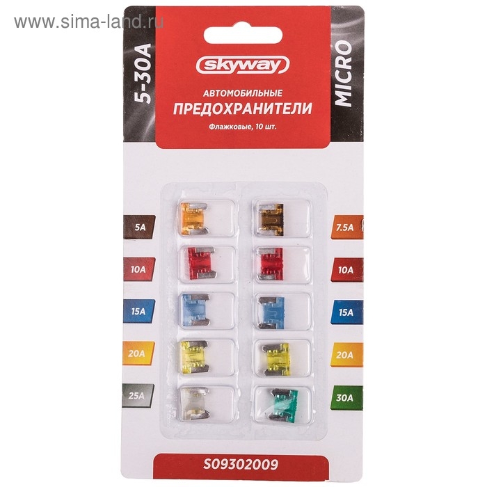 Предохранитель флажковый Skyway, "микро", 5-30 А, блистер, набор 10 шт, S09302009