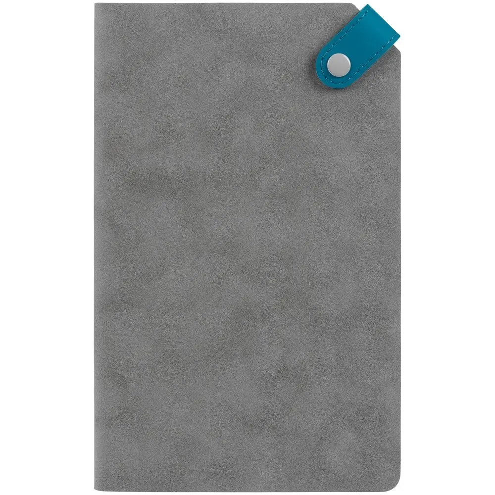 Ежедневник с гибкой обложкой, выполнен из материала Nubuck, серый СС и Soft Touch, морская волна II; дополнен серым ляссе и хлястиком на кнопке.