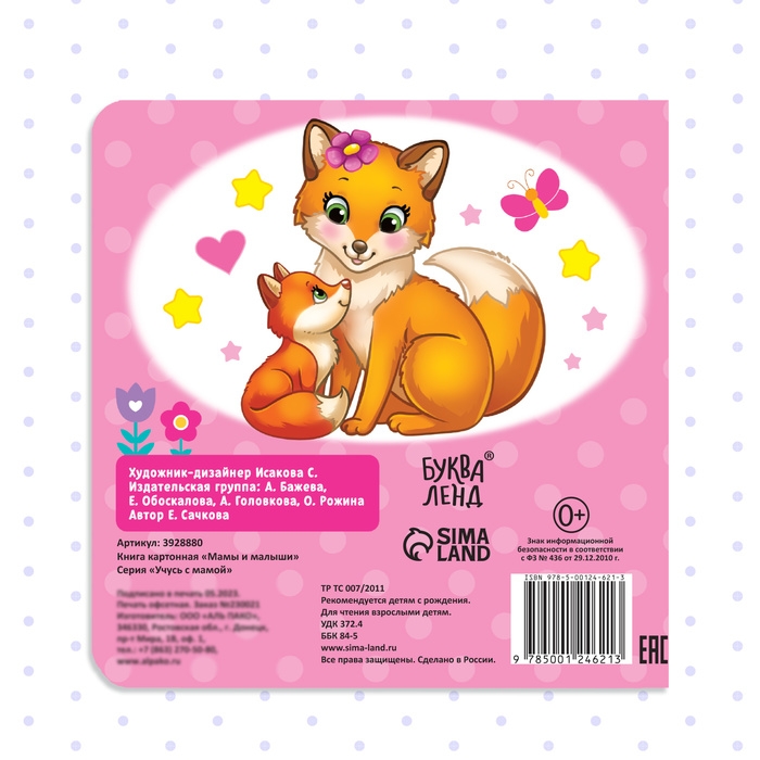 Картонная книга с яркими картинками познакомит кроху с животными и их детёнышами. Ребёнок запомнит названия зверей и с удовольствием послушает стихи про мам и их малышей.