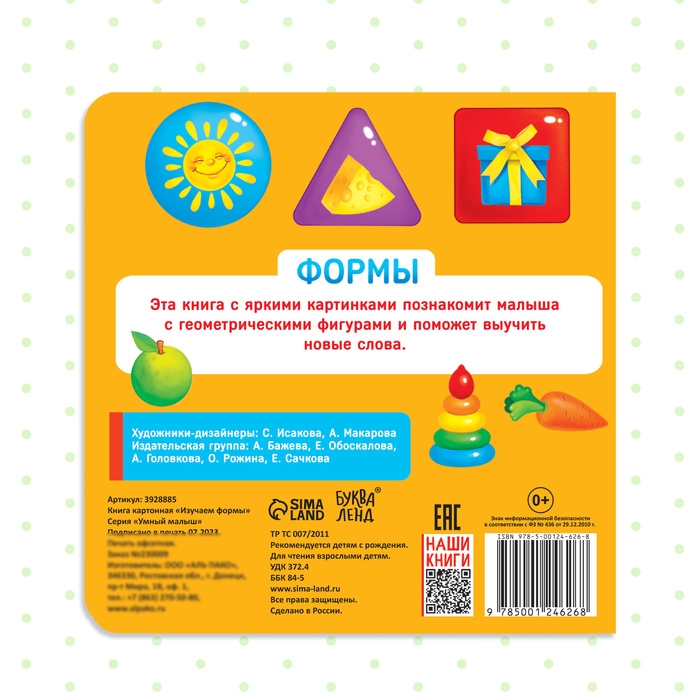 Картонная книга «Изучаем формы» — это яркое и удобное пособие для первых шагов малыша в мир геометрических фигур. Она предназначена для детей от 0 месяцев и помогает развивать зрительное восприятие, мелкую моторику и память.
