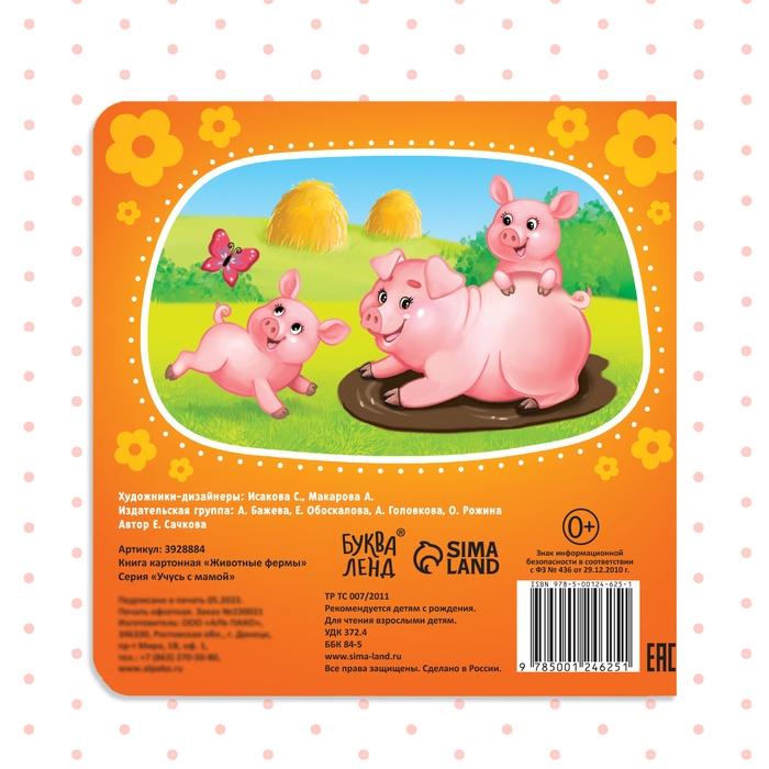 Картонная книга с яркими картинками познакомит малыша с животными, которые живут на ферме. Красочные иллюстрации и весёлые стихи помогут ребёнку запомнить повадки и особенности кур, уток, поросят и других обитателей деревни.
