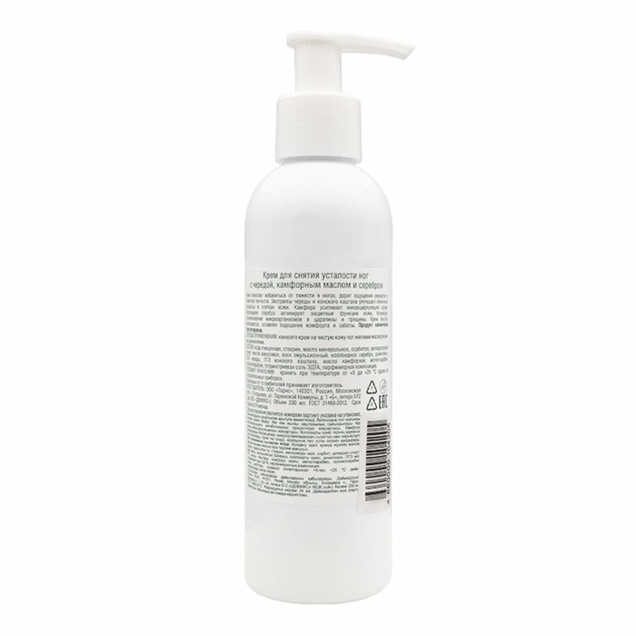 Крем для ног избавляет от тяжести в ногах, придаёт ощущение свежести и приятной лёгкости. Экстракт череды обладает заживляющим действием. Экстракт конского каштана снимает боли в мышцах, улучшают кровообращение. Камфорное масло оказывает болеутоляющее и противовоспалительное действие. Наносеребро обеспечивает надёжную защиту от бактерий и микробов.