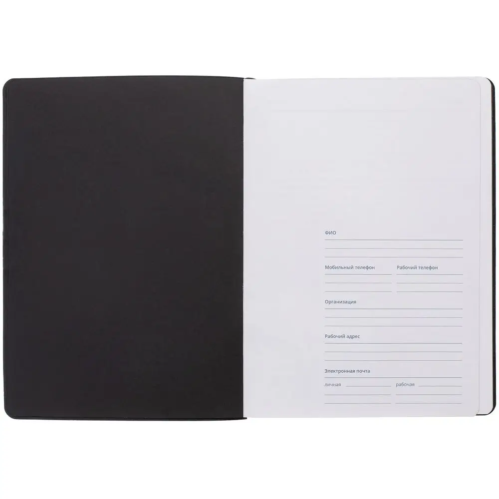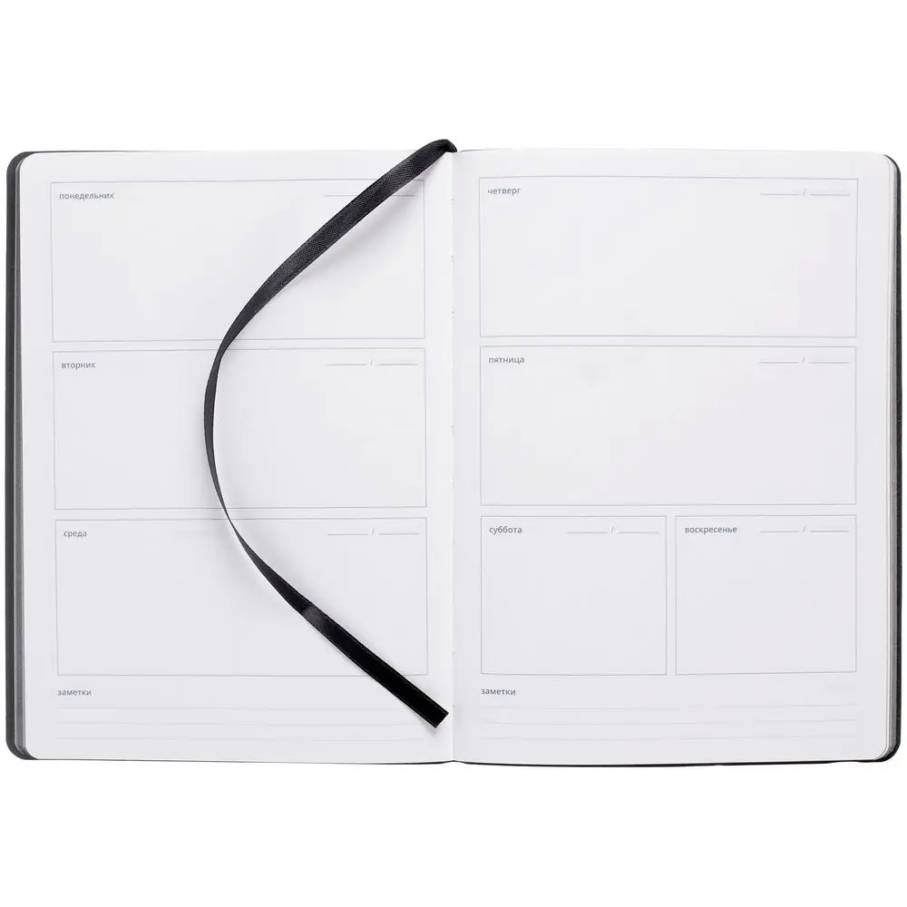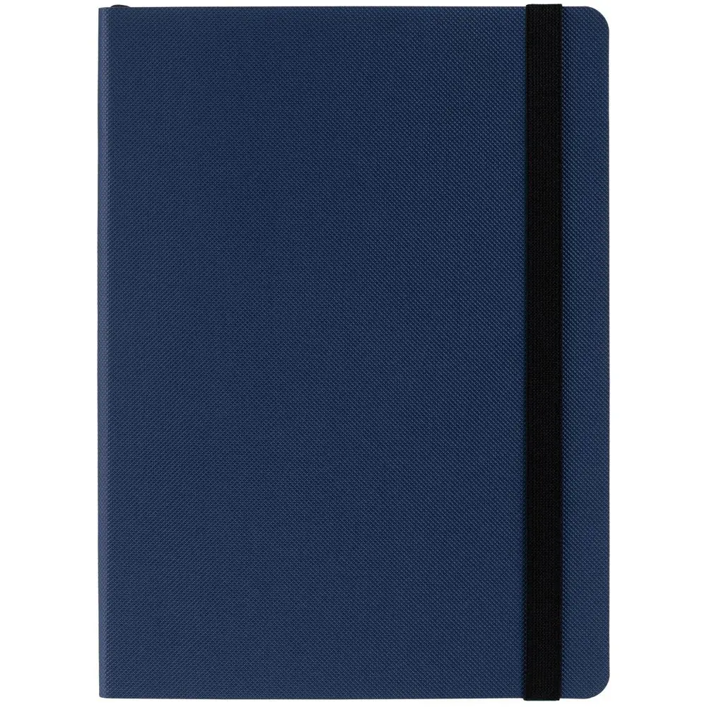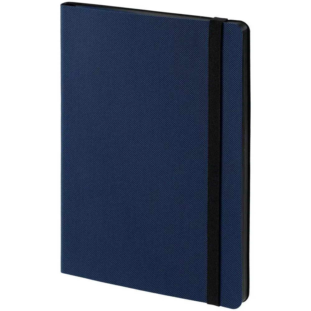 Еженедельник в гибкой обложке выполнен из материала Canyon, темно-синий ХХ, дополнен резинкой и ляссе черного цвета.