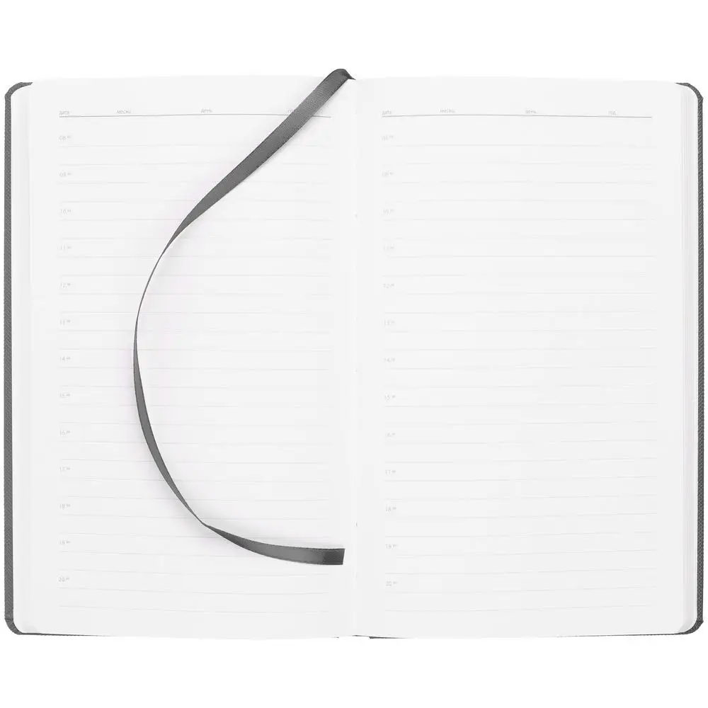 Ежедневник с твердой обложкой, выполнен из материала Canyon, темно-серый ЕЕ, дополнен ляссе в цвет обложки.