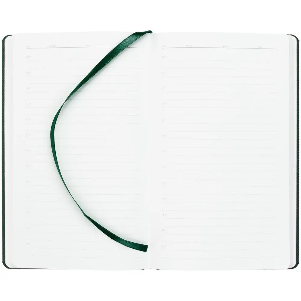 Ежедневник с твердой обложкой, выполнен из материала Canyon, зеленый FF, дополнен ляссе в цвет обложки.